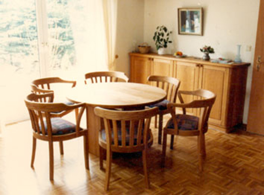 Esszimmer mit Tisch und Stühlen, sowie eine Anrichte aus Eiche